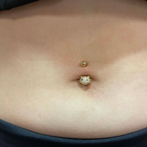 Kirurgilisest terasest tsirkoonkividega kullatud nabaneet. Kassi pea on kaetud sädelevate kivikestega.