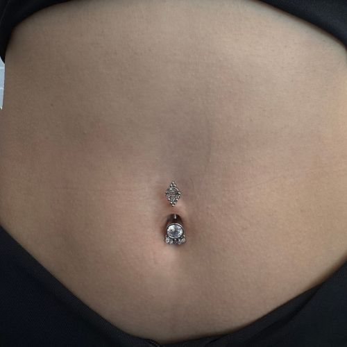 Kirurgilisest terasest hõbedane nabaneet. Valgete tsirkoonidega ripats.